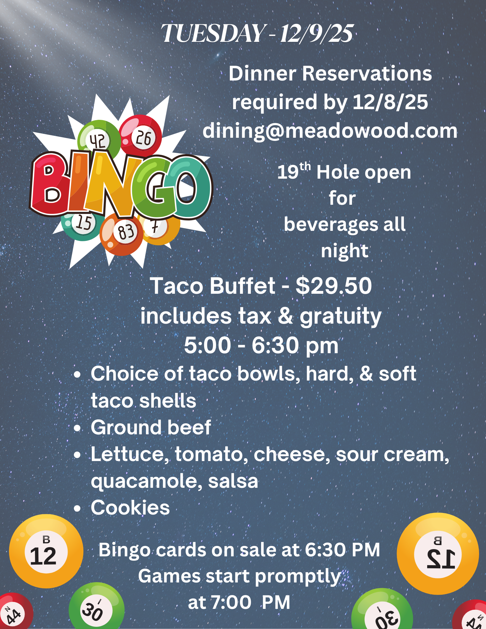 Bingo & Taco Tueday Back Export to Calendar Please load the calendar again. Add to Google Calendar Print Starts: Tuesday December 09, 2025